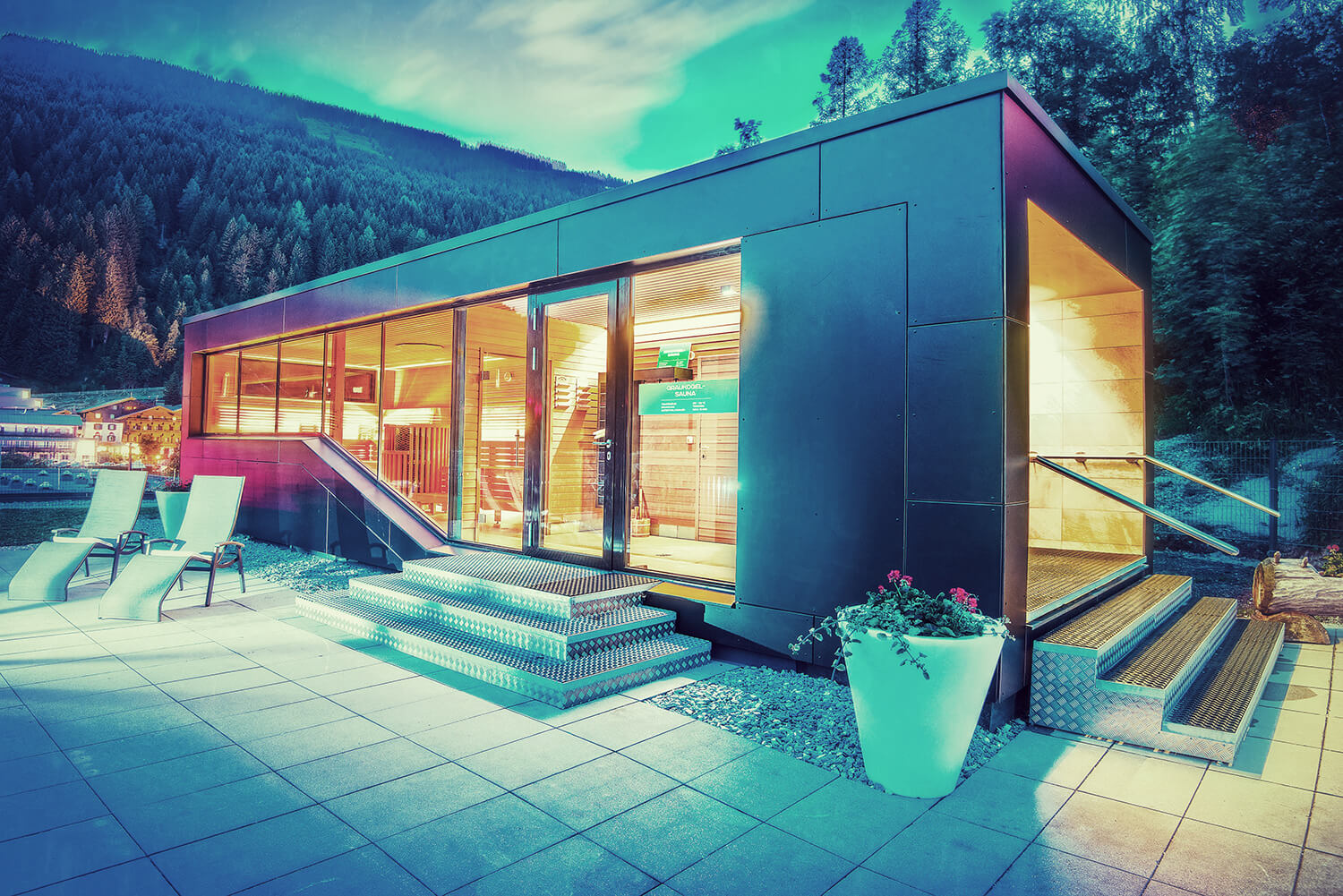 Direkt von der Skipiste am Fuße des Hausbergs der Dorfgasteiner, dem Fulsek, gelangt ihr ins Solarbad: Ski abschnallen, rein, entspannen. Am sonnigsten Platz des Ortes wurde das Gebäude nach der Sonne ausgerichtet und thematisiert diese mit dem kreisrunden Außenbecken sowie dem sonnenstrahlförmigen Bauerwerk. Wer ein kleines, sehr persönliches Bad mit Sauna sucht, ist hier richtig.