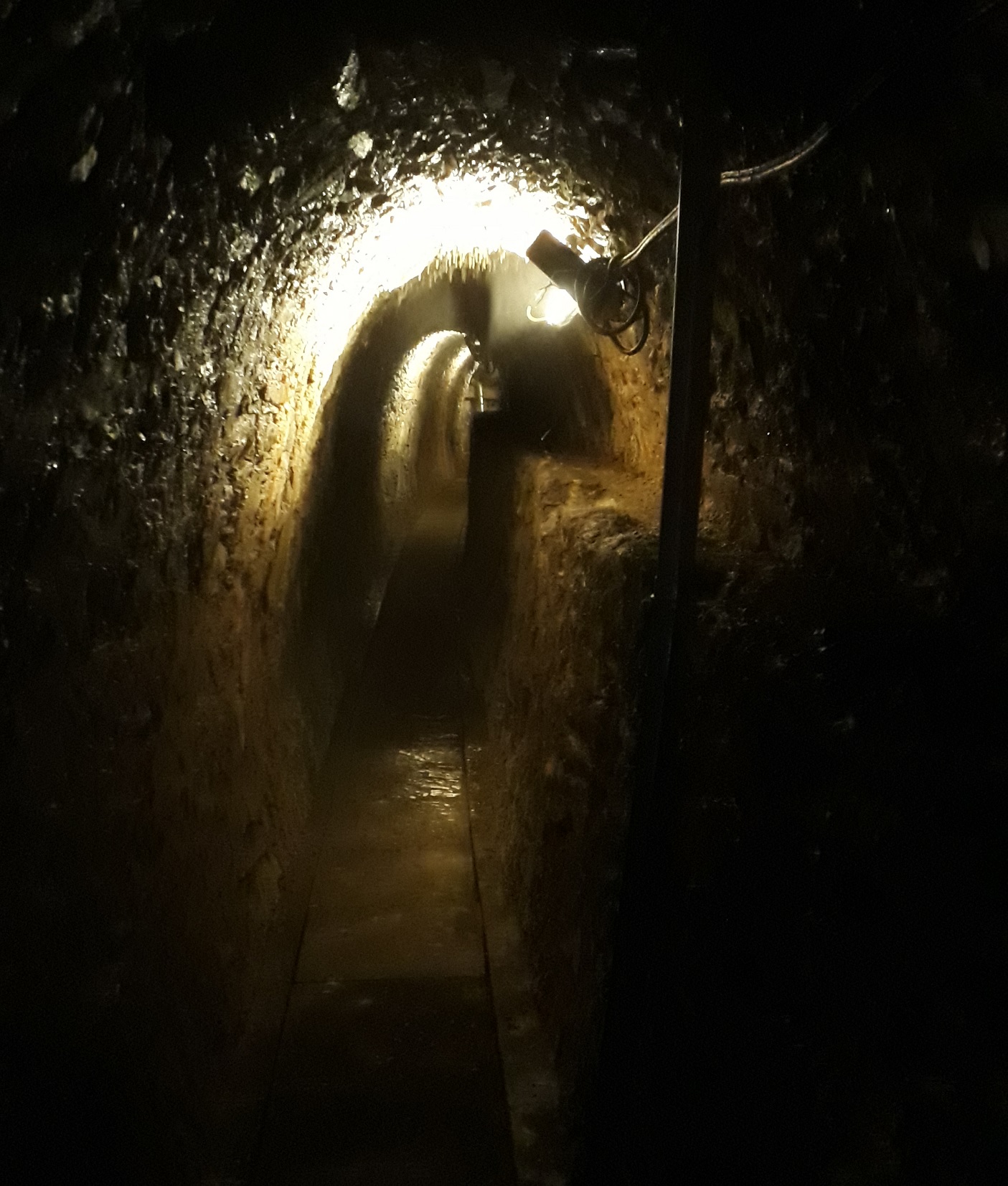 Mit jedem Schritt steigen Temperatur und Luftfeuchtigkeit ein wenig. 160 Meter ist der Stollen lang, der zu den Austrittsstellen führt. Schon nach wenigen Metern muss ich die erste Schicht ablegen. Bald trage ich am Oberkörper nur noch ein völlig verschwitztes T-Shirt. Am Ende des Stollens angelangt, befinden sich 27 Austrittsstellen, aus denen das Thermalwasser direkt aus dem Felsen in Niro-Rohre geleitet wird. An ein, zwei Stellen tropft das Wasser direkt aus dem Felsen. Der dichte Wasserdampf ist das Einzige, was man noch klar erkennen kann. Hier hinten liegt die Luftfeuchtigkeit bei 100 % und die Lufttemperatur bei 45° C. In der Rudolf-Quelle, die wir später noch besichtigen werden, sogar bei 47 °C. Für meine Kamera und mich nur schwer auszuhalten. Wassermeister Georg verzieht keine Miene, er ist dieses Klima – zumindest für kurze Zeit – gewohnt.