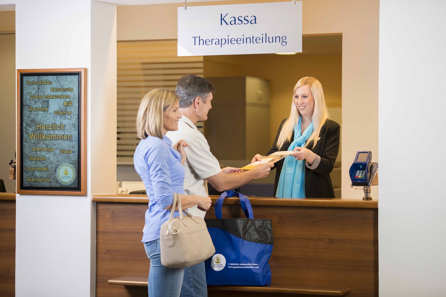 Nach der Anmeldung im Empfangsbereich des Kurhauses werden die Besucher von einem Arzt untersucht. Bei der ersten Einfahrt nehmen Sie zusätzlich an einem Kureinführungsvortrag teil, bei welchem allerlei Wissenswertes über die Therapie erzählt wird. Vor der Einfahrt sollten Sie einen halben Liter Wasser trinken, dazu können Sie auch den Brunnen im Wartebereich nutzen.