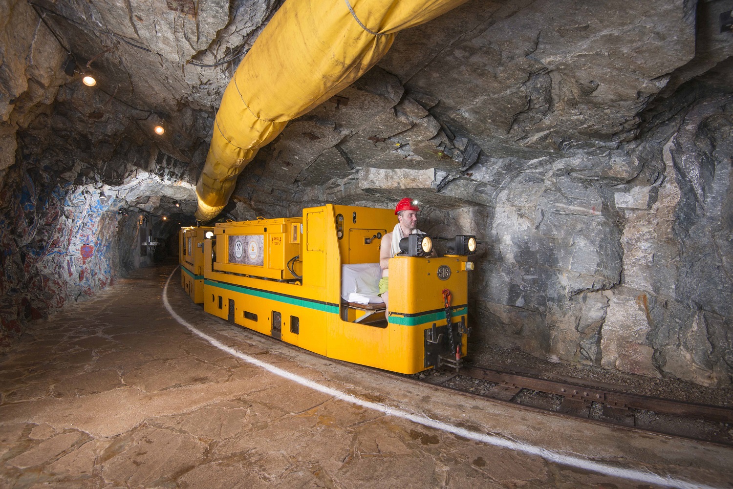 Im Anschluss geht es für die Teilnehmer mit dem Zug zwei Kilometer waagerecht in den Berg hinein. Bereits die Einfahrt mit dem gelben Fahrzeug ist ein spezielles Erlebnis. Man spürt, wie die Temperaturen immer wärmer werden und sich ein angenehmes Gefühl auf der Haut langsam ausbreitet. Die Luftfeuchte steigt ebenfalls und die ersten Schweißperlen bilden sich. Besonders bei der ersten Einfahrt ist man – zusammen mit den Sitznachbarn – besonders gespannt, was da wohl kommen mag.