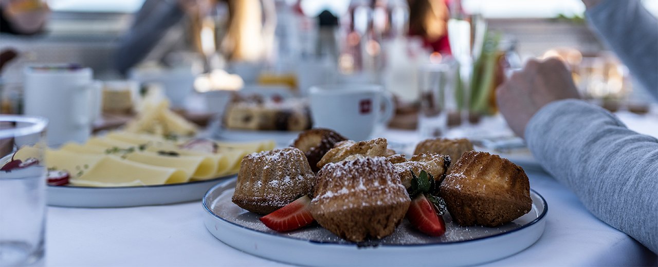 But there is no end to the pleasure: In a glass-aluminum dome in the midst of the snow-covered peaks of the Alps, the table has already been richly laid. Freshly prepared regional dishes, cordial service and - last but not least - the magnificent panoramic view of the surrounding mountains, make this early morning excursion an experience you won't soon forget.