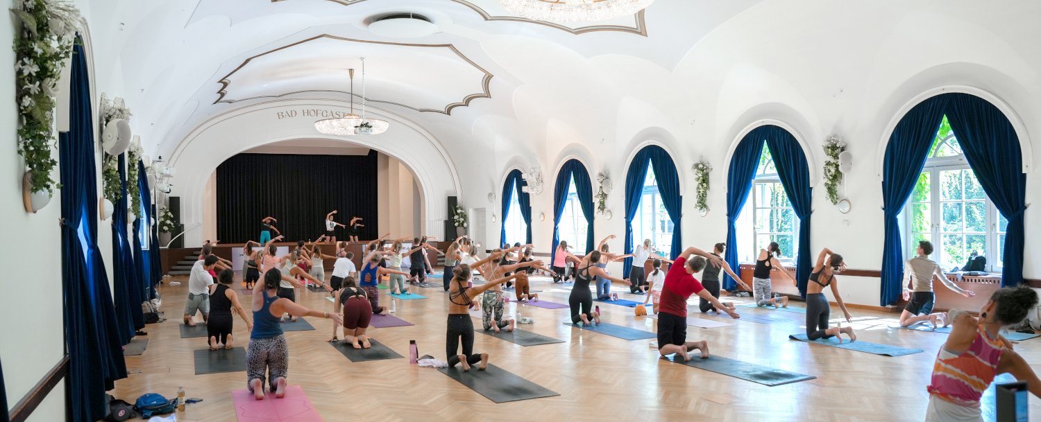 The large seminar room at the Bad Hofgastein Congress Center is the most versatile room at the yunion Yoga Festival. Massage workshops, business coaching and yin yoga classes take place here. The acoustics in this room are excellent, and the floor-to-ceiling windows provide plenty of brightness for the workshops.