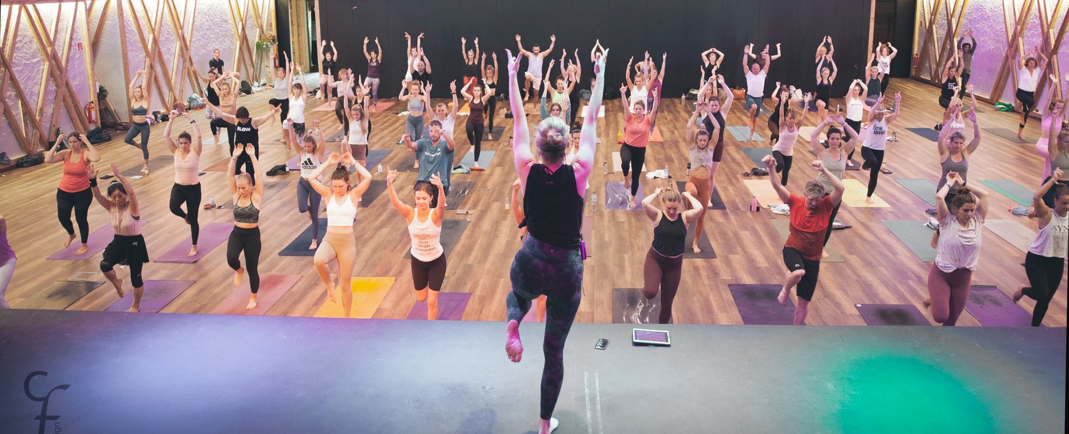 The Flowstage in the Gastein Alm is with its over 500 m² the largest event space of the yunion yoga festivals. The wooden floor is quiet and the sound is fantastic. The teachers are perfectly understandable up to the last corner. The modern lighting system sets the entire room in harmonious light scenes and creates very special moments of atmosphere.