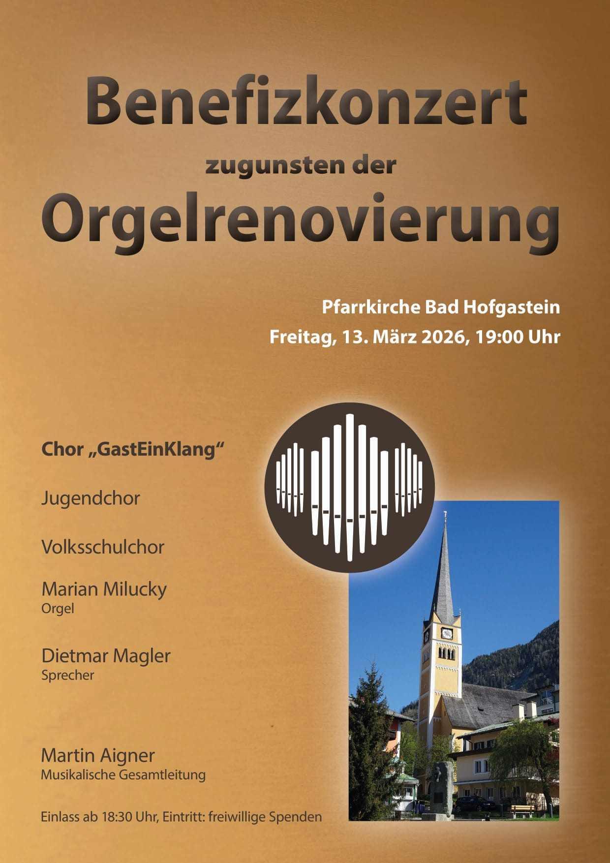 Ein besonderes musikalisches Zeichen der Solidarität setzt der Chor GasteinKlang am Freitag, dem 13. März 2026, um 19.00 Uhr in der Pfarrkirche Bad Hofgastein: Im Rahmen eines Benefizkonzertes erklingen Chormusik und Orgelklänge zugunsten der Orgel-renovierung in der Pfarrkirche Bad Hofgastein.Der gesamte Erlös des Abends kommt diesem wichtigen Projekt zugute, der Eintritt erfolgt auf Basis freiwilliger Spenden.