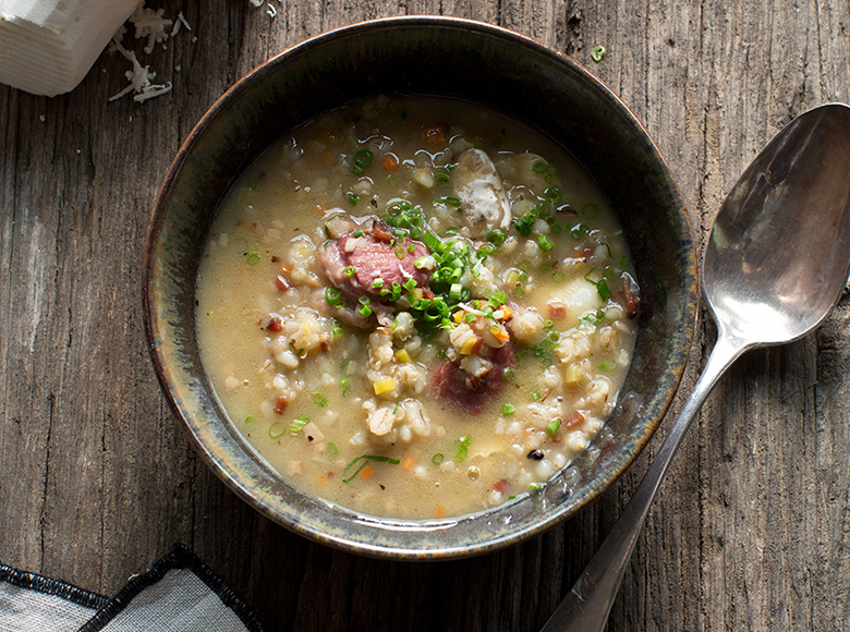 Salzburger Gerst‘lsuppe mit gesurten Schweinsbackerl, Wurzelgemüse und Kren