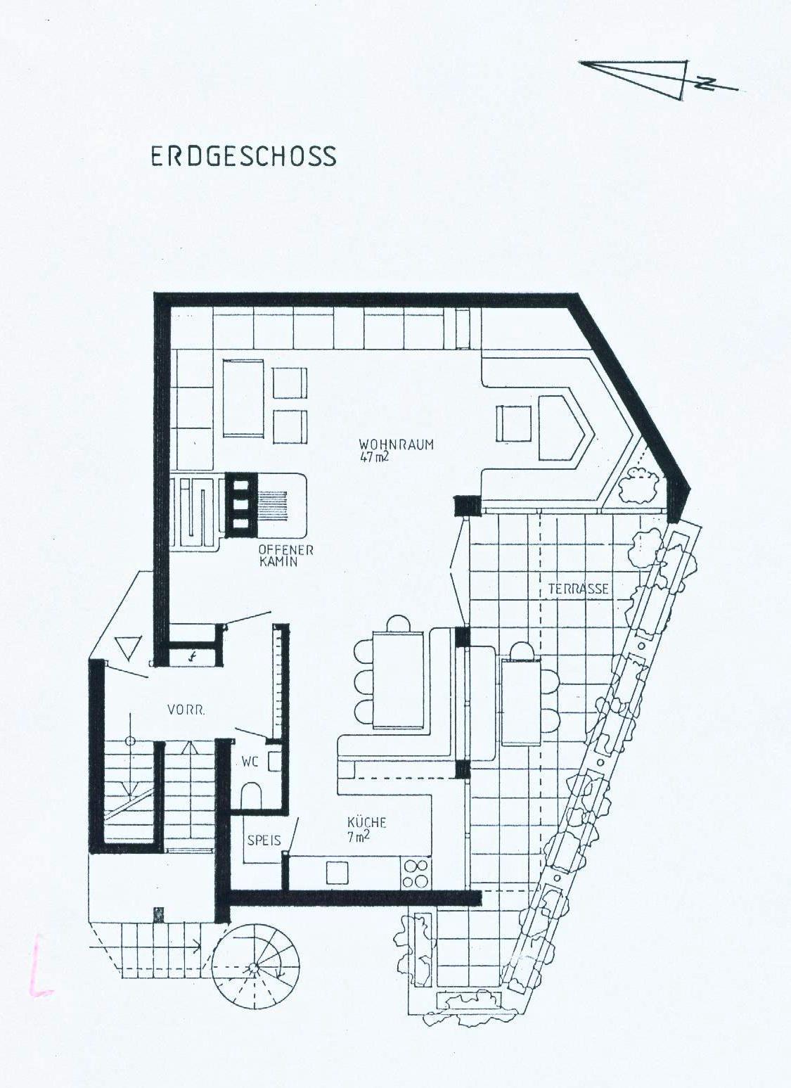 Die vom Architekten gestalteten Räume spielen mit persönlichem Flair, wie handgemalte Bilder , offen gestalteter Küche in kompletter Ausstattung und dem angrenzenden großen Esstisch für gesellige Abende, auch in größerer Runde. Am großen, offenen Kamin in der Raummitte lodert und